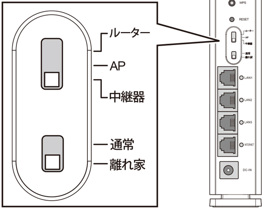 本製品の背面にある動作モードの切り替えスイッチを「中継器」、および「離れ家」に合わせます。