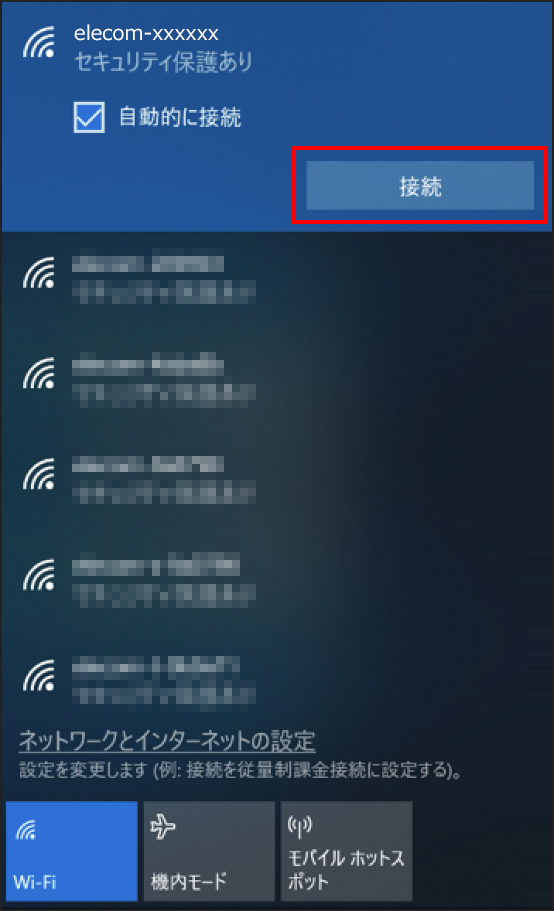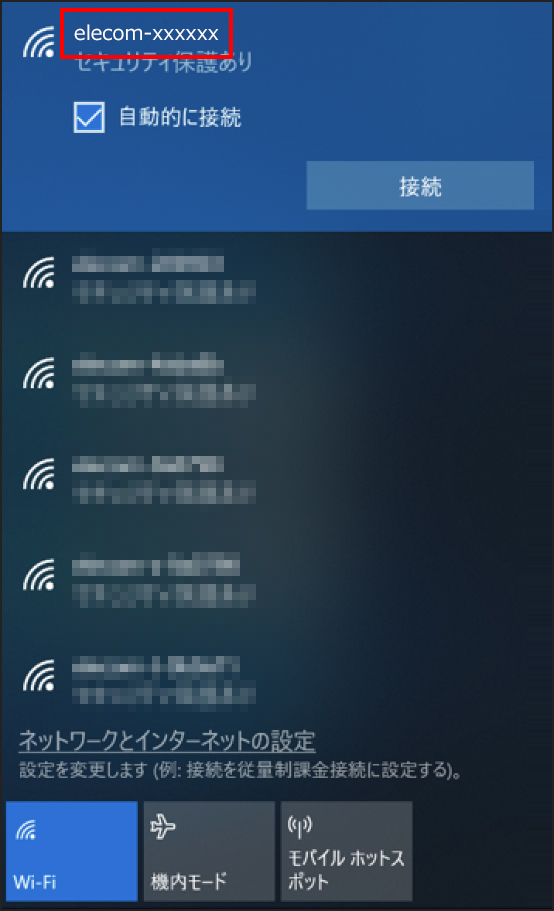 表示された一覧の中からお使いの用途にあわせて本製品のSSID(Wi-Fi名)を選択し、[接続]をクリックします。
