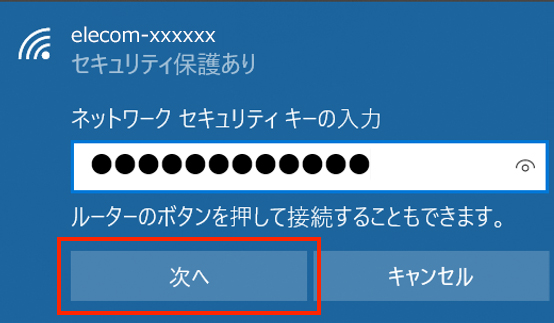 本製品の暗号化キー(Wi-Fiパスワード)を入力し、[次へ]または[OK]をクリックします。