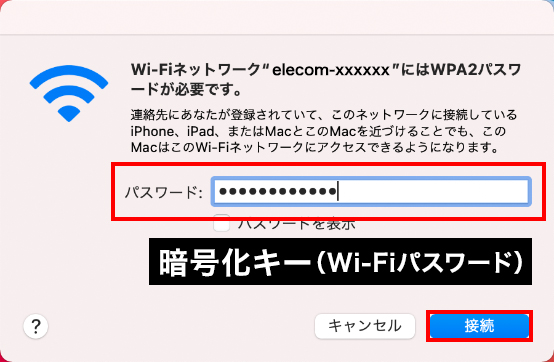 本製品の暗号化キー(Wi-Fiパスワード)を入力し、[接続]をクリックします。