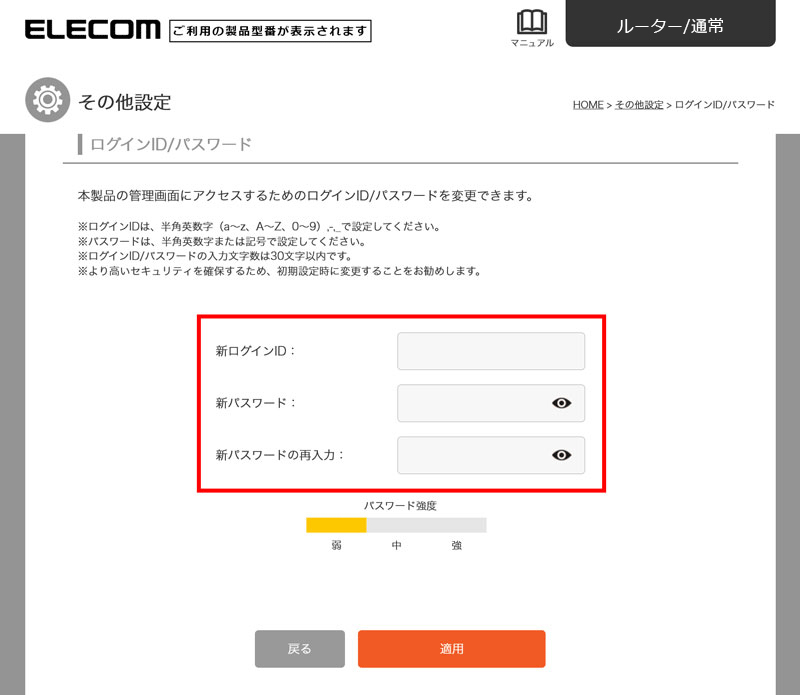 この画面で、新ログインIDと新ログインパスワードを入力し、「適用」を選択します。