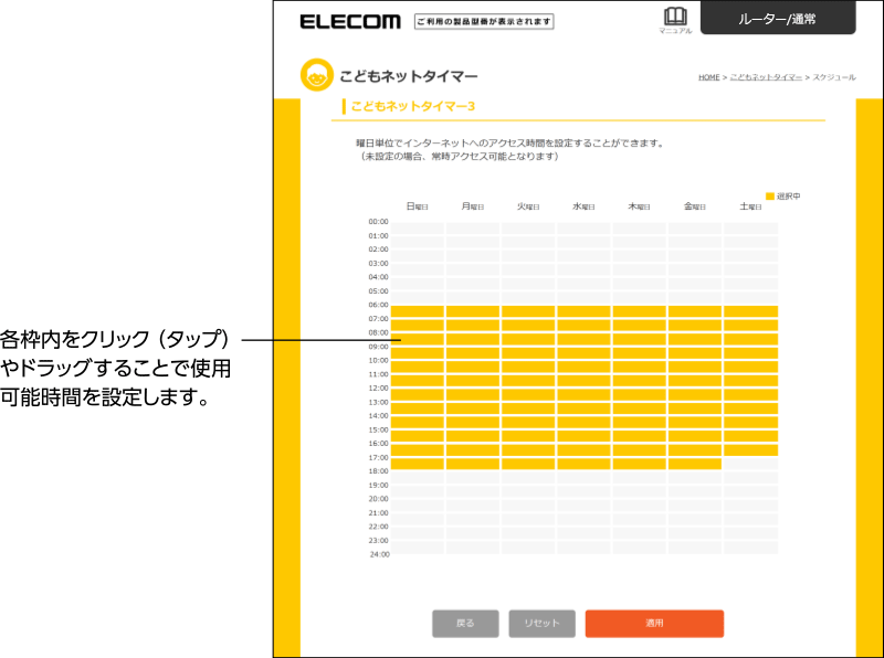 使用を可能にする時間帯の枠内をクリック(タップ)やドラッグすることで、インターネットの使用時間帯を設定します。