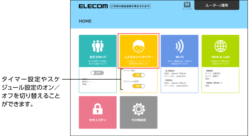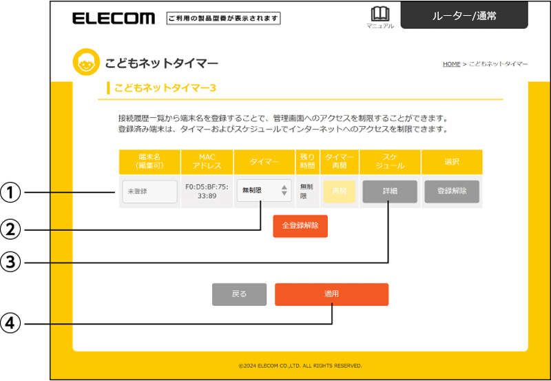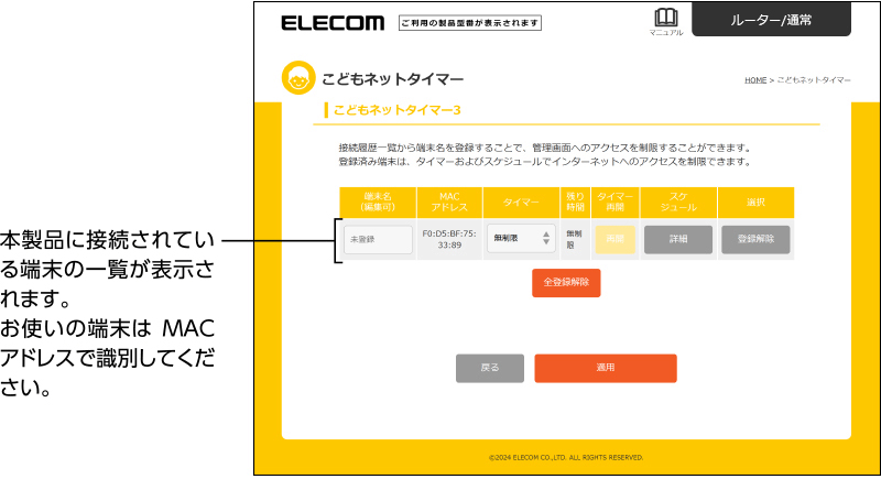 本製品に接続している端末に対して、インターネットに接続できる時間や曜日を個別に設定することができます。