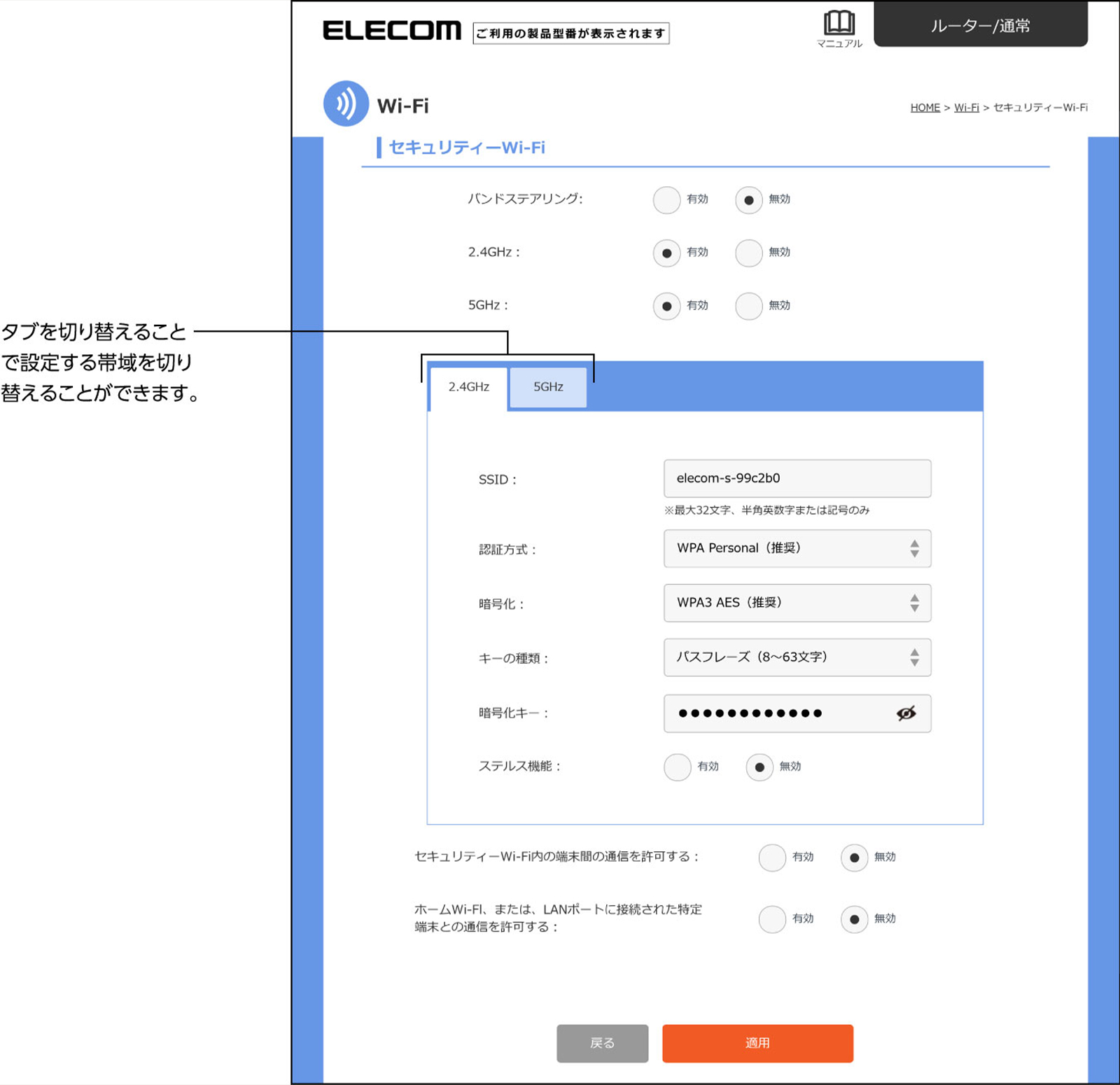 | キーの種類 | 暗号化キー(Wi-Fiパスワード)の入力形式を選択します。 パスフレーズ(8〜63文字) HEX(64文字) |