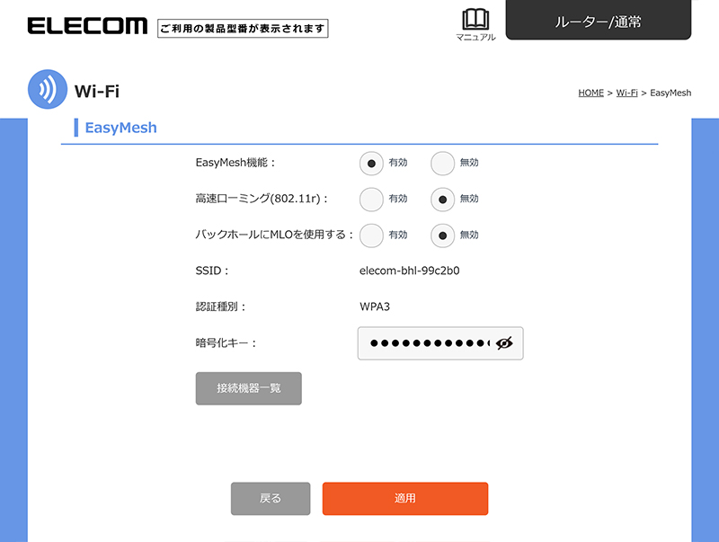 | EasyMesh | EasyMesh 機能や高速ローミング機能の有効/ 無効の切り替えを行います。詳細 |