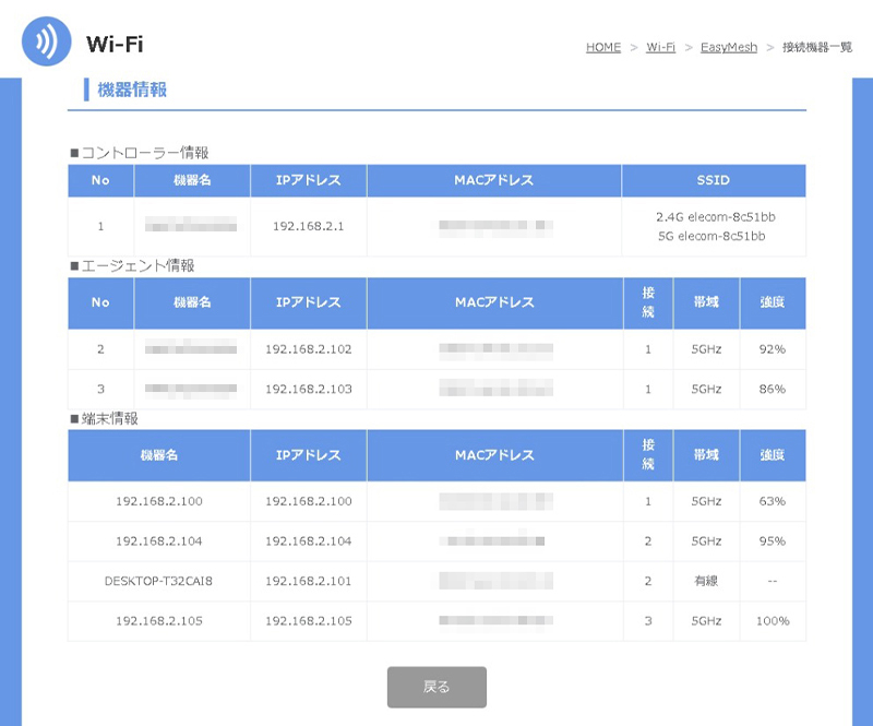 通常は変更する必要はありません。接続機器一覧 メッシュネットワーク内に接続されている機器情報を一覧表示します。
