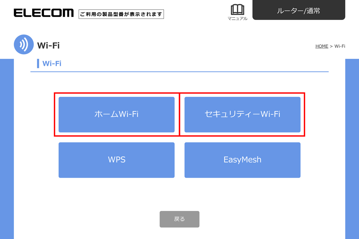 「Wi-Fi」画面が表示されるので、「ホームWi-Fi」または「セキュリティWi-Fi」を選択します。