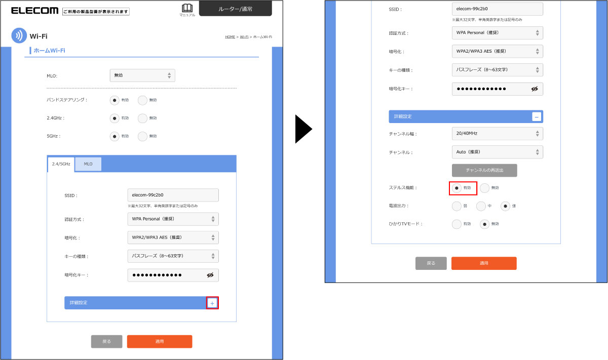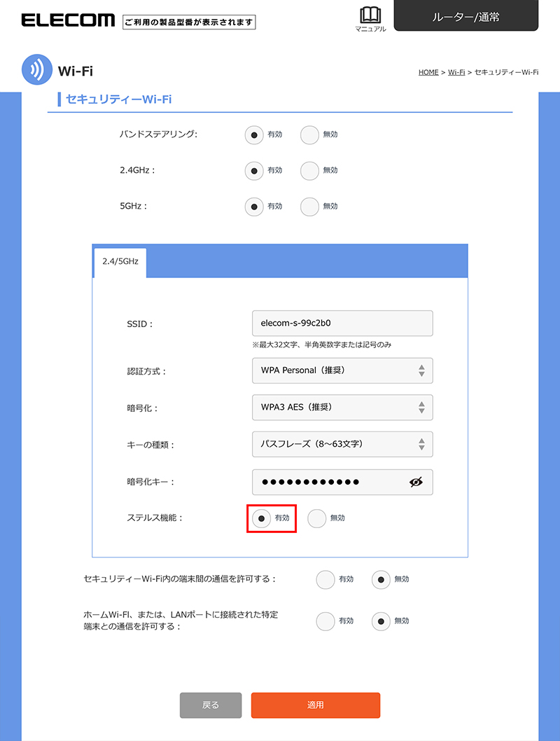 「SSID」設定画面が表示されますので、「ステルス機能」の「有効」にチェックを入れ、「適用」を選択します。