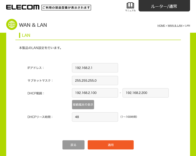 WAN&LAN(ルーターモード)> LAN側の設定をしたい