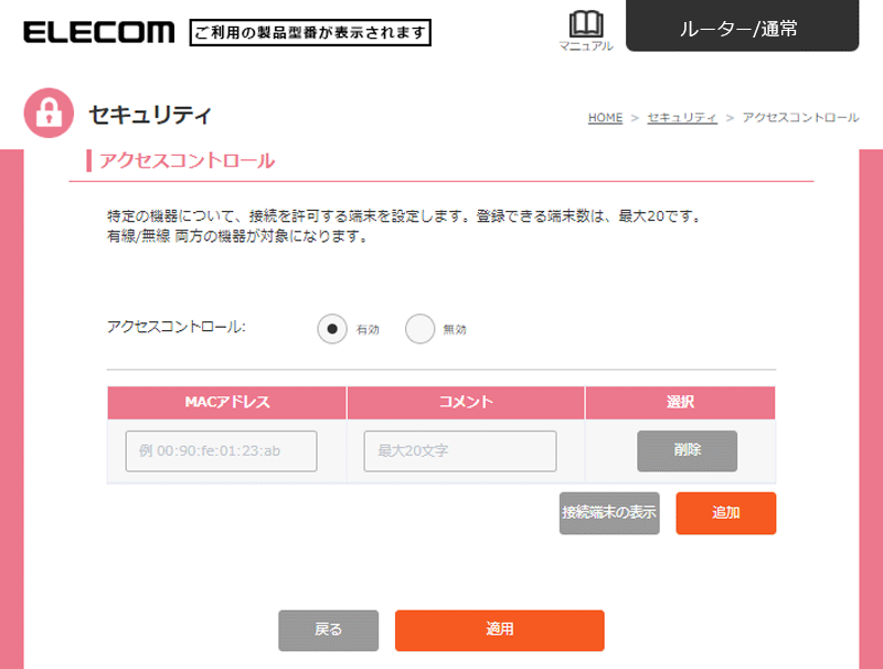 特定の機器からの接続を許可します。最大20件まで設定できます。この設定はルーターモード時のみ設定できます。