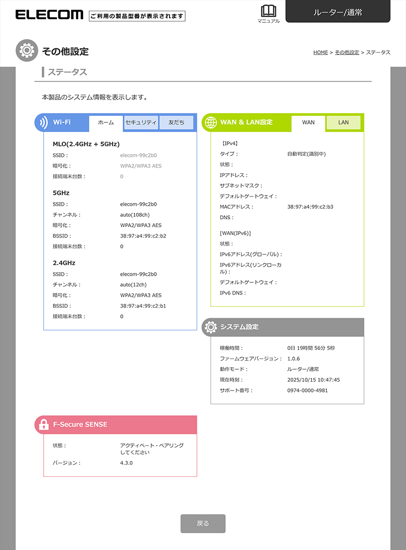 | ステータス | 本製品に関するさまざまなステータス情報を確認することができます。詳細 |