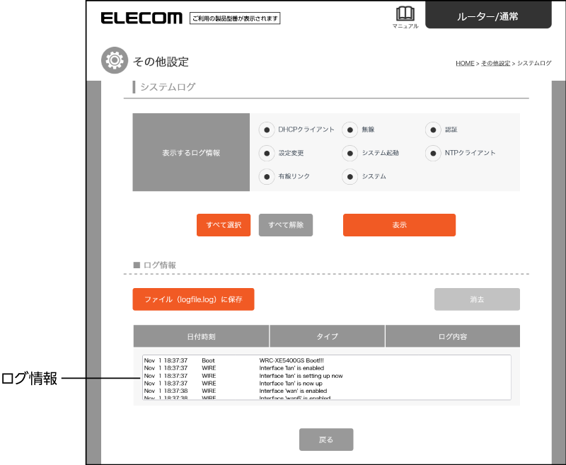 ルーターを再起動または初期化すると、ログ情報は削除されますのでご注意ください。