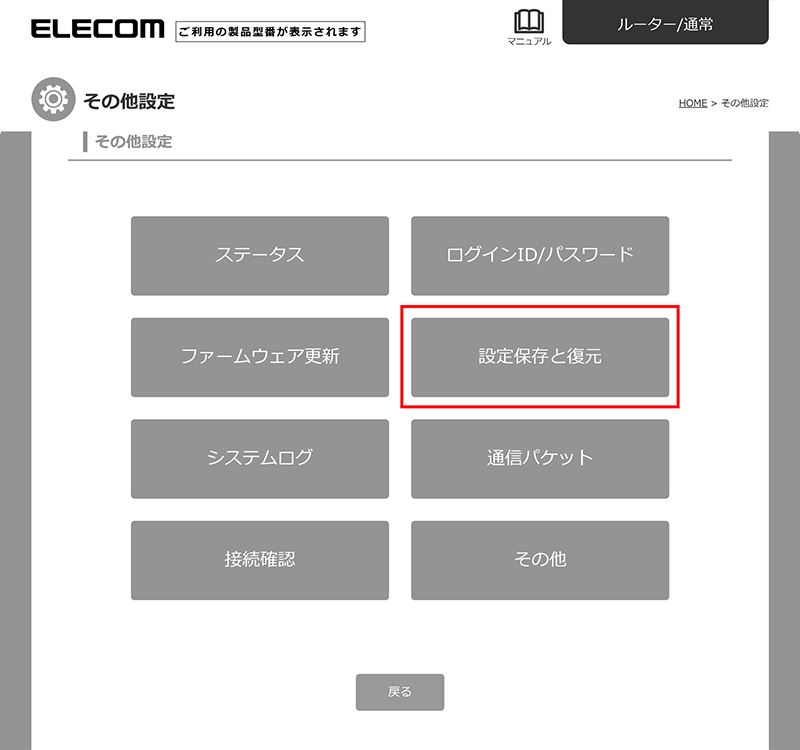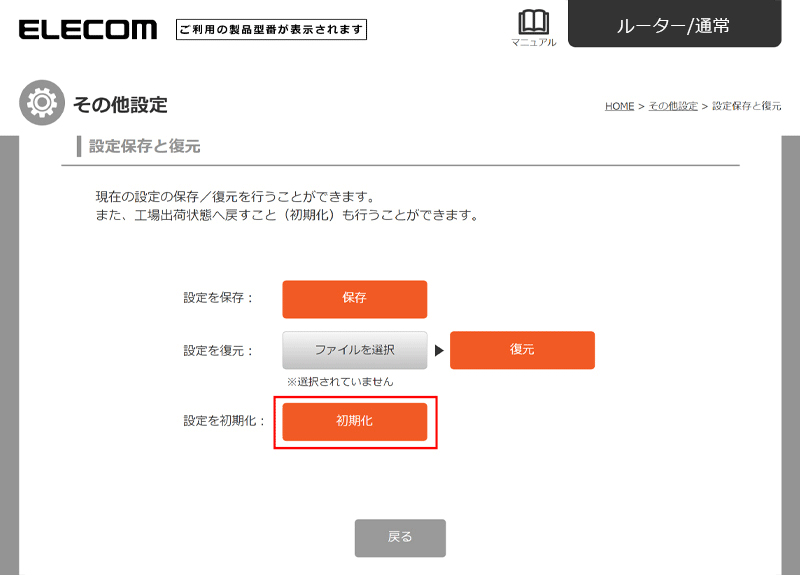 また、事前に本製品の設定画面(管理画面)「その他設定」-「設定保存と復元」から現在の設定内容を保存できます。初期化後は同じ画面から設定を復元することができます。詳細
