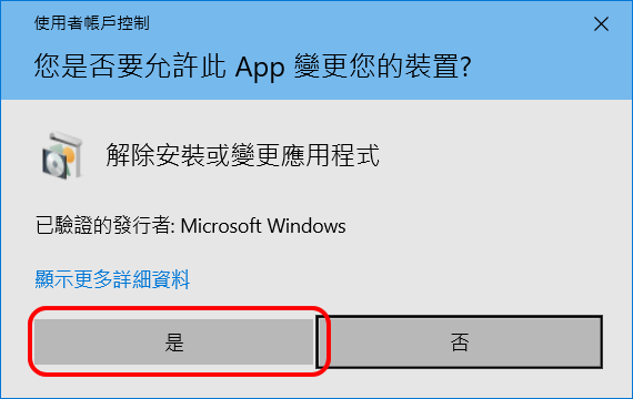 - 當出現「使用者帳戶控制」視窗時,點擊「是」按鈕。