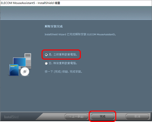 - 解除安裝完成後,確保勾選「是,立即重新啟動電腦。」並點擊「完成」按鈕。