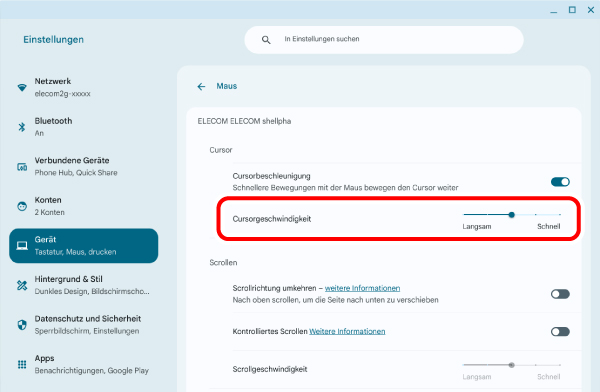 4) Stellen Sie die Geschwindigkeit des Mauszeigers mit dem Schieberegler „Cursorgeschwindigkeit“ von „ELECOM shellpha“ ein.