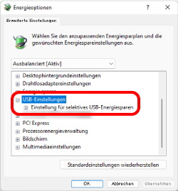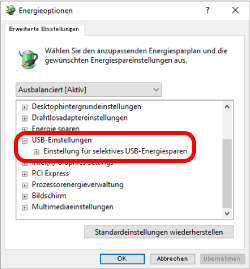 Bei Windows wird die Stromversorgung des über USB angeschlossenen Geräts automatisch ausgeschaltet, um den Stromverbrauch des PC zu senken.