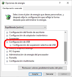 9) En la pantalla “Opciones de energía”, haga clic en la marca “+” de “Configuración de USB” de la lista y, a continuación, haga clic en la marca “+” de “Configuración de suspensión selectiva de USB”.
