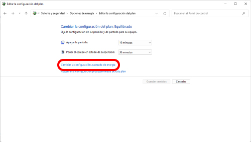 3) En la pantalla “Editar la configuración del plan”, haga clic en “Cambiar la configuración avanzada de energía”.