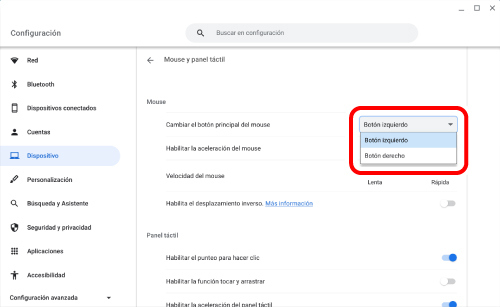 4) Haga clic en el menú desplegable "Canbiar el botón principal del mouse" y, a continuación, en "Botón derecho".