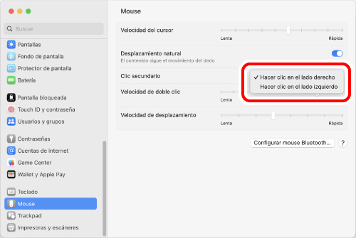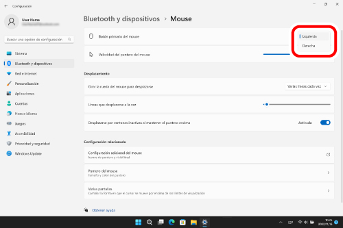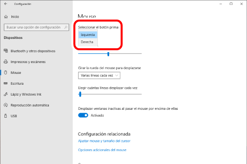 *Si se cambia la configuración del sistema operativo, los botones de clic izquierdo y clic derecho también se intercambiarán por otros mouse utilizados simultáneamente en la misma computadora.