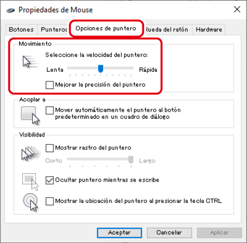 2) Ajuste el control deslizante "Velocidad del cursor" para ajustar la velocidad del puntero del mouse.