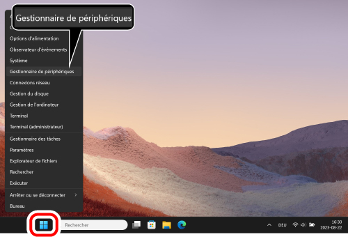 1) Cliquez à droite sur « Démarrer » et ouvrez « Gestionnaire de périphériques ».