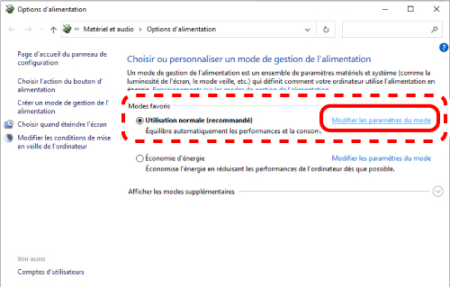 7) Cliquez sur « Modifier les paramètres du mode » à droite de l’élément sélectionné dans « Plan d’alimentation ».
