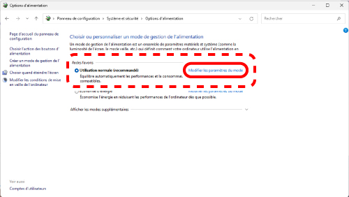 2) Cliquez sur « Modifier les paramètres du mode » à droite de l’élément sélectionné dans « Plan d’alimentation ».