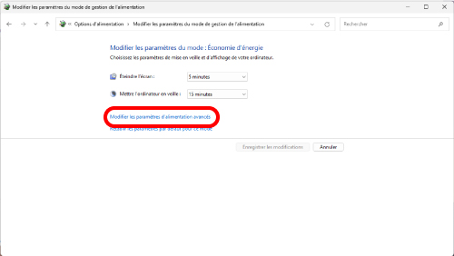 3) Sur l’écran « Modifier les paramètres du mode de gestion de l'alimentation », cliquez sur « Modifier les paramètres d’alimentation avancés ».
