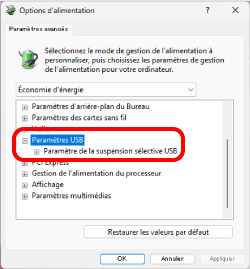 4) Sur l’écran « Options d’alimentation », cliquez sur la marque « + » dans « Paramètres USB » dans la liste, puis cliquez sur la marque « + » dans « Paramètre de la suspension sélective USB ».