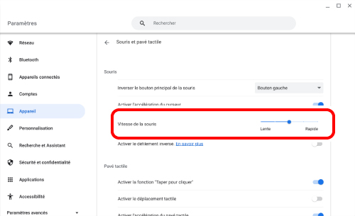 4) Réglez le curseur « Vitesse de la souris » pour ajuster la vitesse du pointeur de la souris.