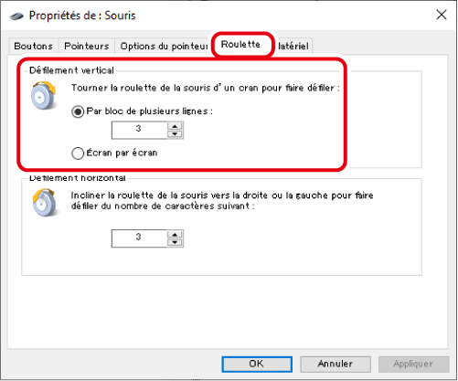 3) Modifiez la valeur de « Par bloc de plusieurs lignes » sous « Tourner la roulette de la souris d'un cran pour faire défiler ».