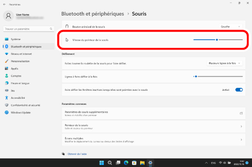 3) Ajustez la barre de défilement « Vitesse du pointeur de la souris » pour régler la vitesse de déplacement du pointeur de la souris.