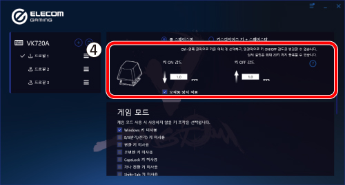자세한 내용은 ‘ELECOM GAMING Tool(EG Tool) 설정’ -'게이밍 모드 설정’을 참조하십시오.