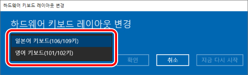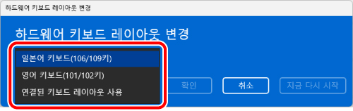 6) ‘하드웨어 키보드 레이아웃 변경’ 화면에 표시된 풀다운 메뉴에서 ‘일본어 키보드(106/109 키)’를 선택한 다음 ‘지금 다시 시작’을 클릭해 PC를 다시 시작합니다.