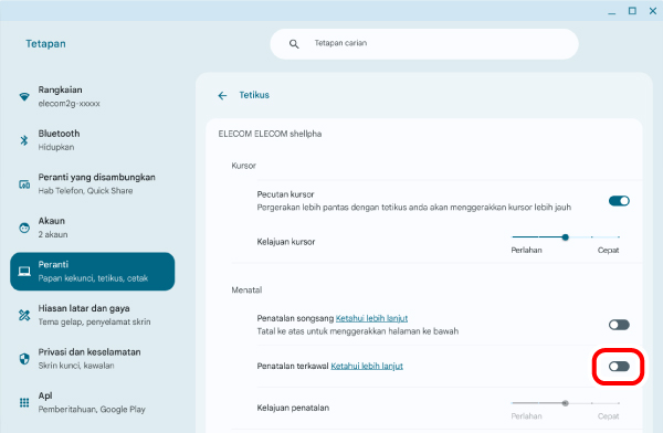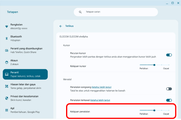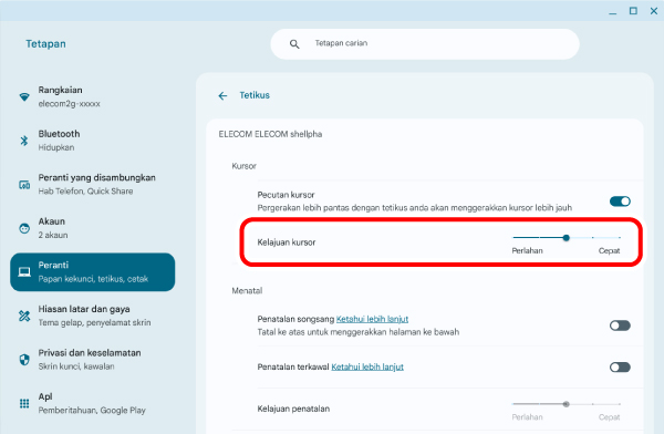4) Laraskan kelajuan penuding tetikus menggunakan peluncur “Kelajuan kursor” “ELECOM shellpha”.
