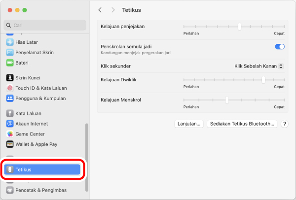 Halaman tetapan “Tetikus” akan dipaparkan.