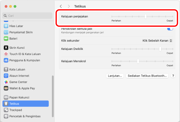 2) Laraskan peluncur “Kelajuan penjejakan” untuk melaraskan kelajuan penuding tetikus.