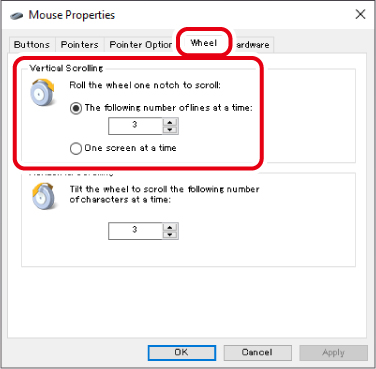 3) Tukar nilai “The following number of lines at a time (Bilangan baris berikut pada satu masa)” di bawah “Roll the wheel one notch to scroll (Gulung roda satu takuk untuk menatal)”
