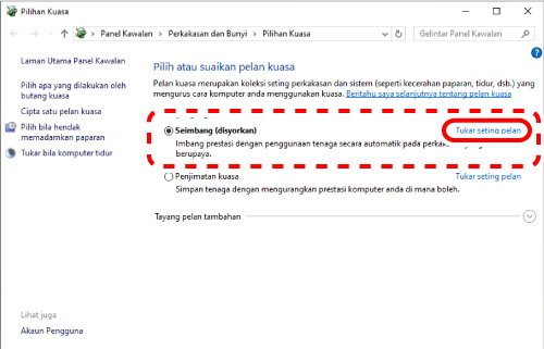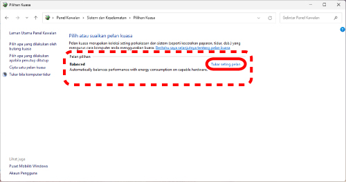 2) Klik “Tukar seting pelan” di sebelah kanan item yang dipilih dalam “Pelan Kuasa”.