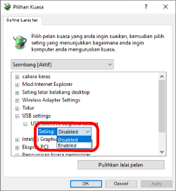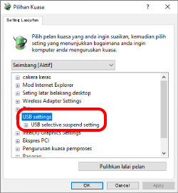 9) Pada skrin “Pilihan Kuasa”, klik tanda “+” dalam “USB setting (tetapan USB)” daripada senarai, dan kemudian klik tanda “+” dalam “USB selective suspend setting (Tetapan penggantungan terpilih USB)”.
