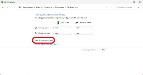 3) Pada skrin “Edit Seting Pelan”, klik “Tukar seting kuasa lanjuan”.