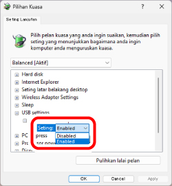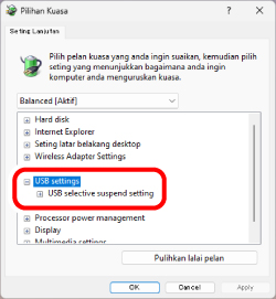 Pada Windows, untuk mengurangkan penggunaan kuasa bergantung pada PC, kuasa produk yang disambungkan dengan USB ditetapkan untuk dimatikan secara automatik.