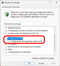 9) Na tela “Opções de Energia”, clique no símbolo “+” em “Configurações USB” da lista e, em seguida, clique no símbolo “+” em “Configuração de suspensão seletiva USB”.
