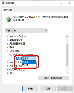 4) 在“电源选项”界面,单击列表中“USB设置”中的“+”标记,然后单击“USB选择性暂停设置”中的“+”标记。