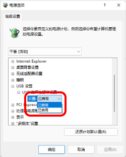 4) 在“电源选项”界面,单击列表中“USB设置”中的“+”标记,然后单击“USB选择性暂停设置”中的“+”标记。