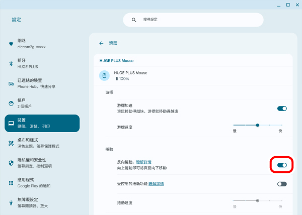 您必須從我方的網站上下載及安裝「ELECOM Mouse Assistant 6」,才能使用 Windows 上的左右捲動功能。請參閱「安裝 ELECOM Mouse Assistant 6」。