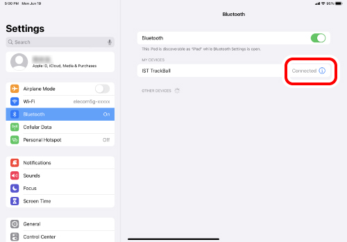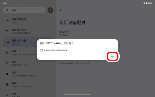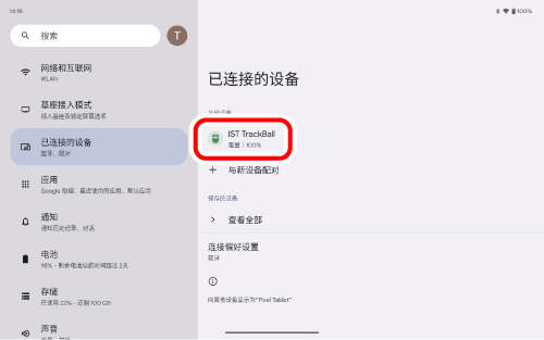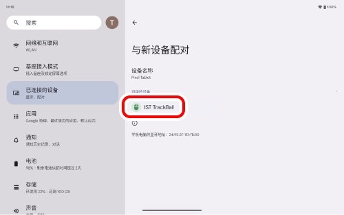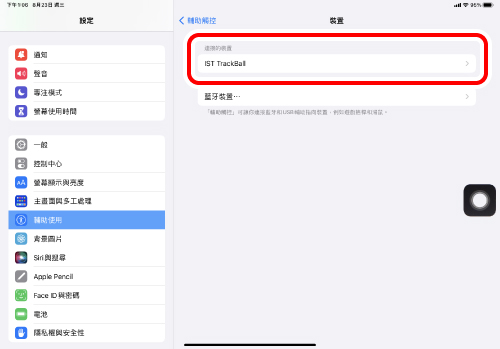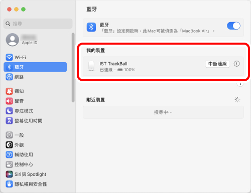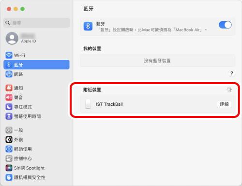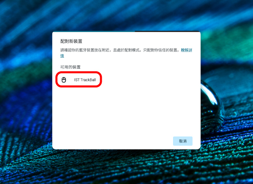 像第 2 步一樣,點擊「藍牙」。當「IST TrackBall」出現在「目前已連線的裝置」下方時,配對即告完成。