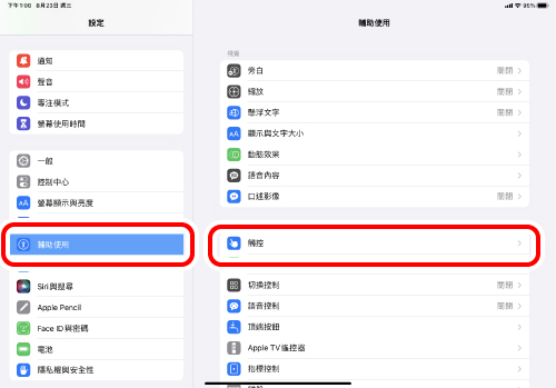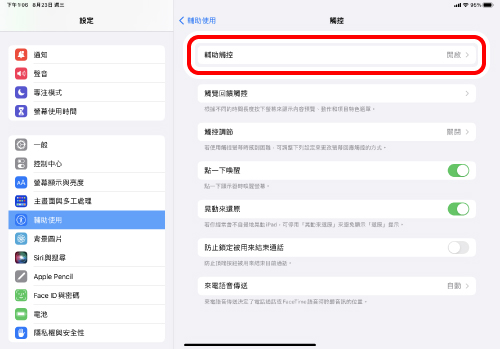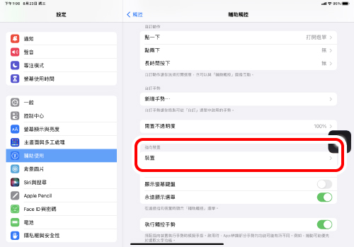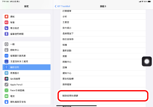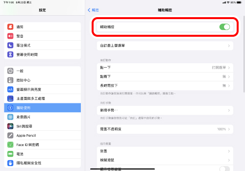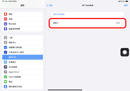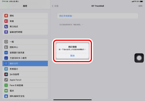 當「輔助觸控」為「OFF」時,「自訂動作」功能將被停用,只能使用初始的右鍵點擊、左鍵點擊和滾輪滾動功能。